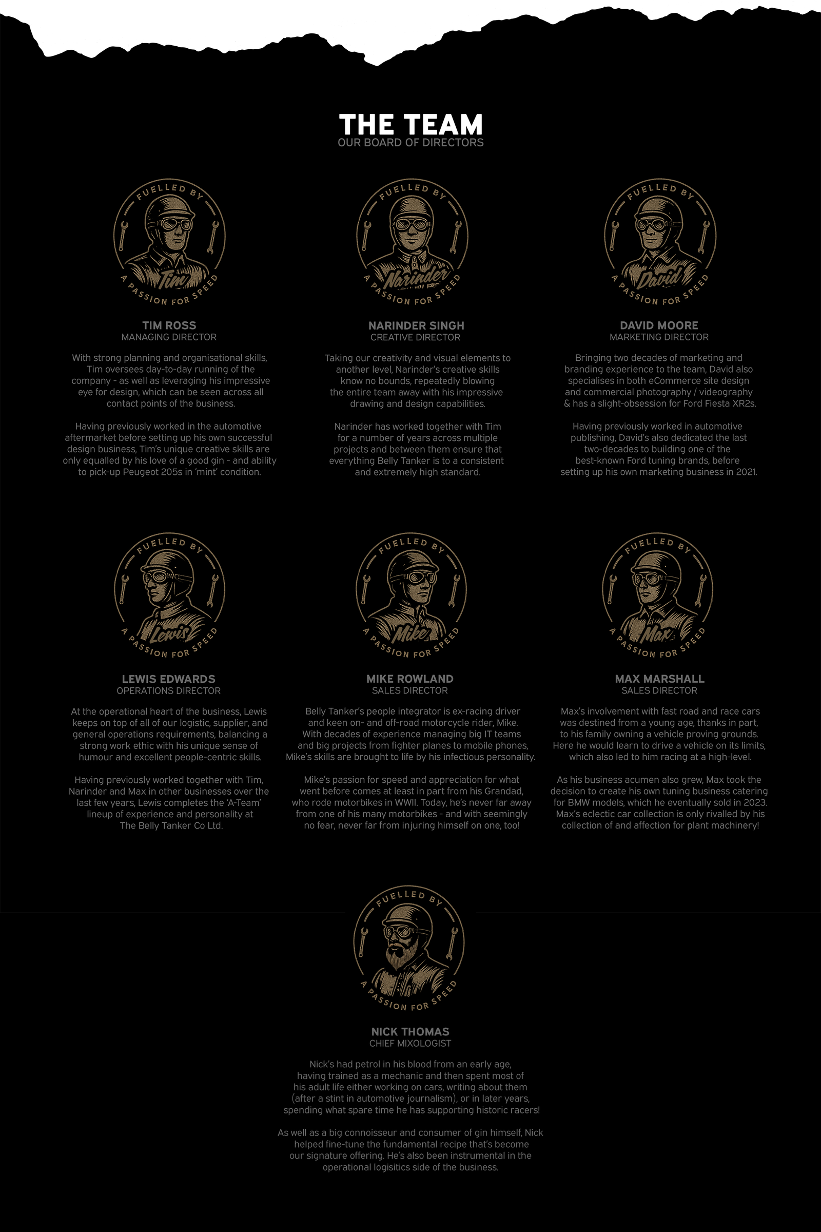 Joined by colleagues and friends who share his fervor for the automotive world, the team brings together a wealth of talent, from design to project management. Together, they crafted The Belly Tanker brand as a tribute to the daring servicemen of the war and a celebration of all things automotive, blending their skills and passions into every bottle.